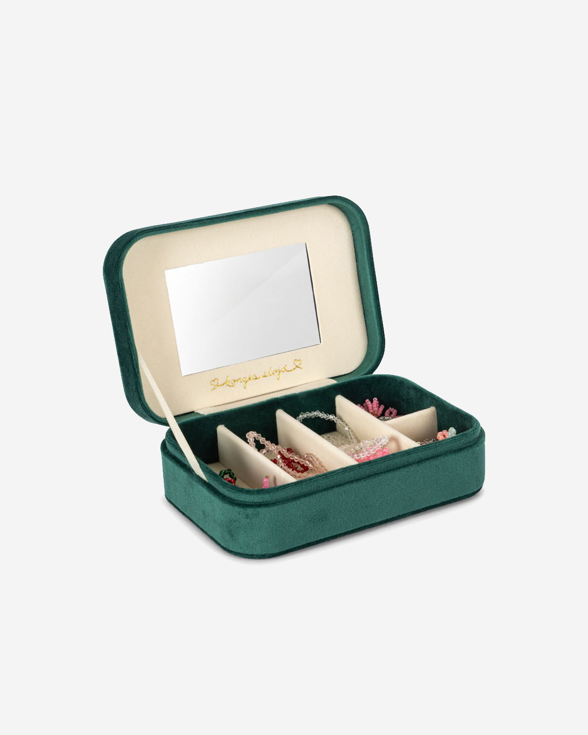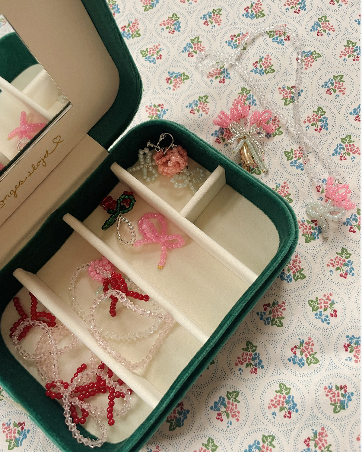 Sweet velvet jewelry box with all the pearly jewelry you could possibly dream of. All bracelets and necklaces are elastic and suitable for all.