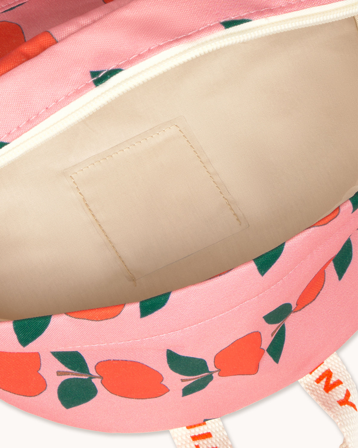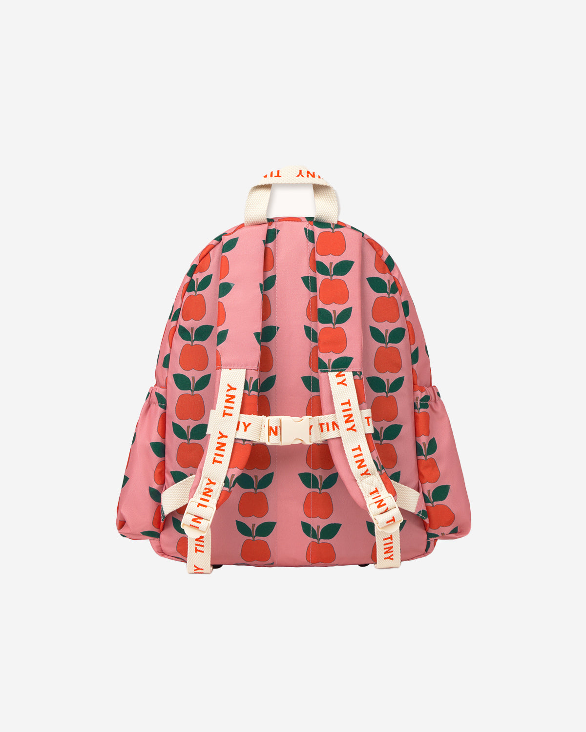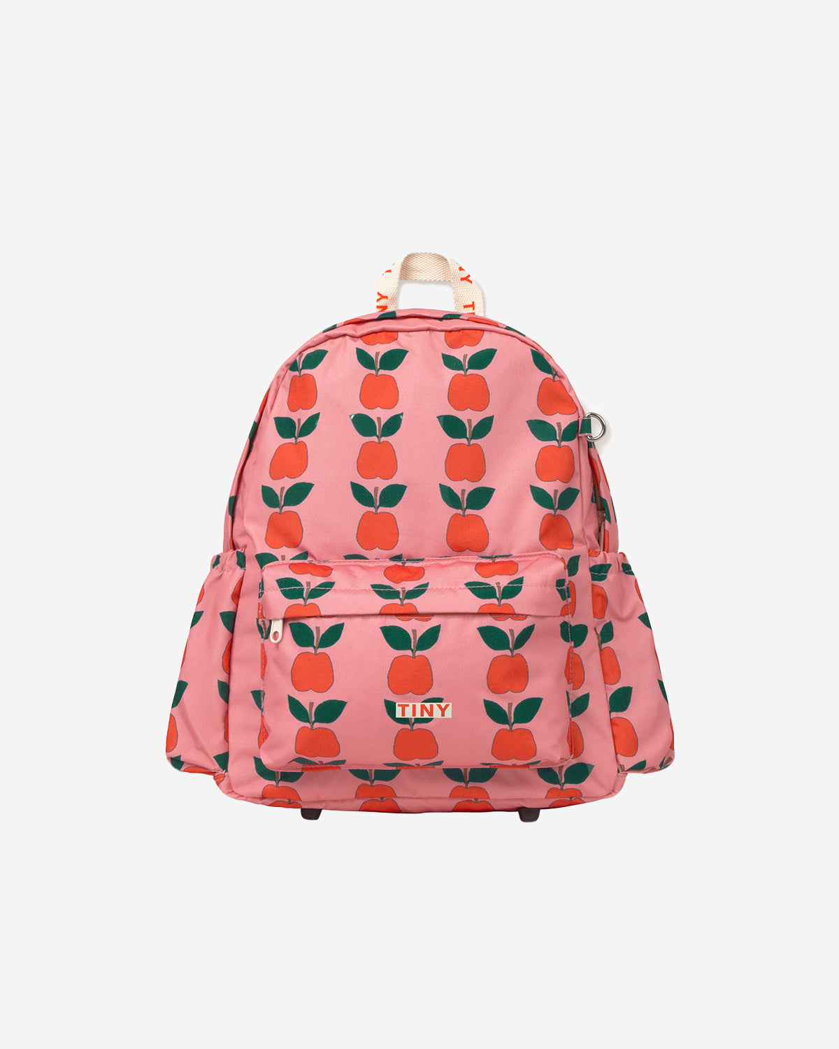 This Apples printed backpack combines playful design with practical features. It’s crafted with a top handle, padded shoulder straps, and two side pockets for easy storage. The front pocket offers quick access to small essentials, while the main zippered compartment keeps everything secure. Fully lined and padded on the back and straps, it includes an interior elastic band to hold a water bottle firmly in place. One side pocket features an insulating layer, and a practical plastic pieces help keep the bag clean when placed on the ground. Finished with a waterproof coating for extra protection, this backpack is perfect for school days or casual outings.