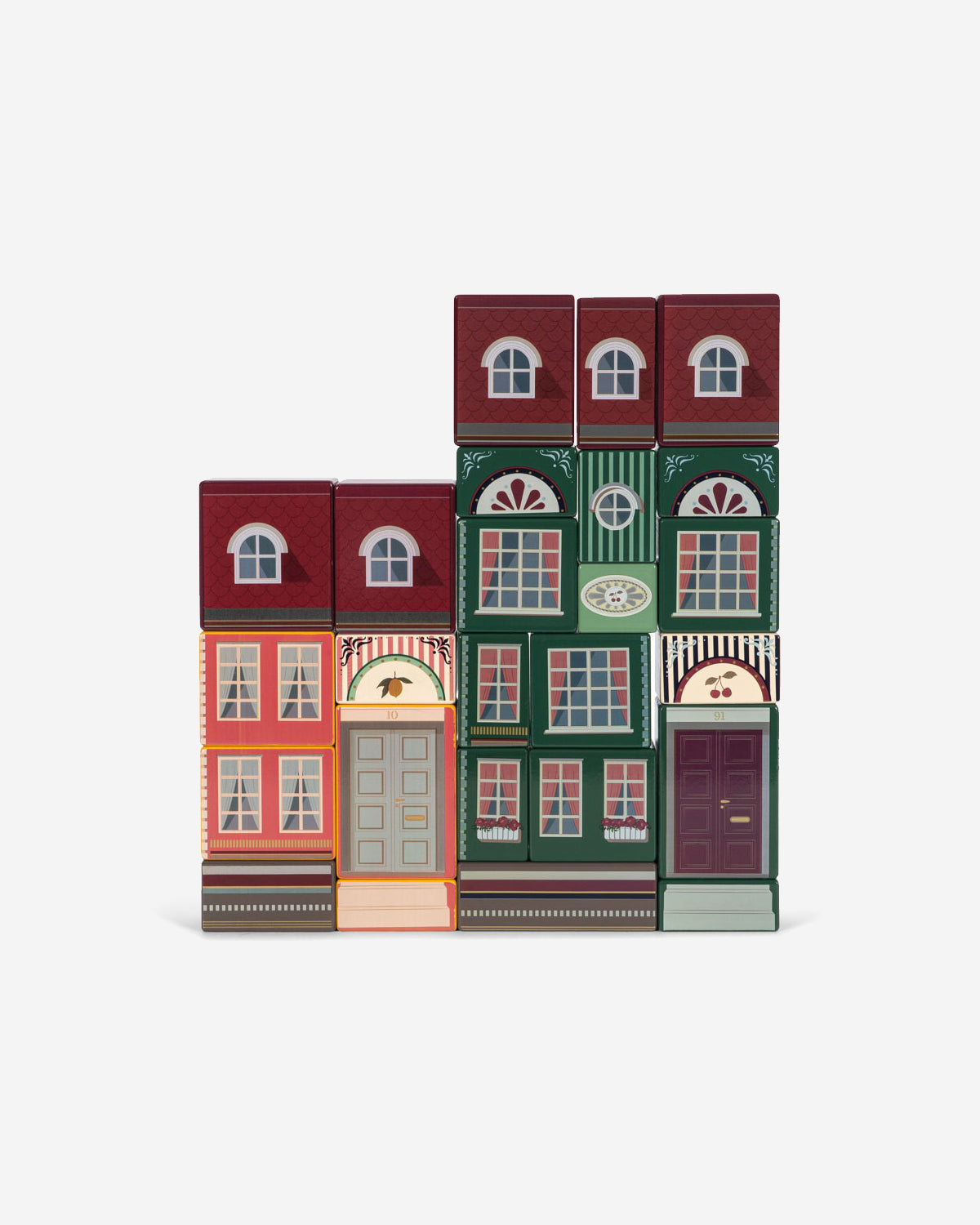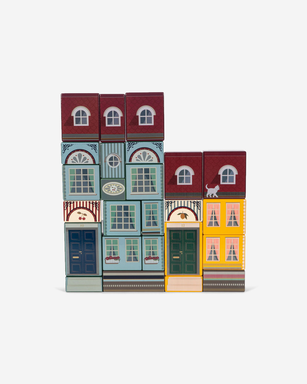 Build your own little house with our wooden building blocks. Find inspiration in the illustration on the box, or make your very own custom version.