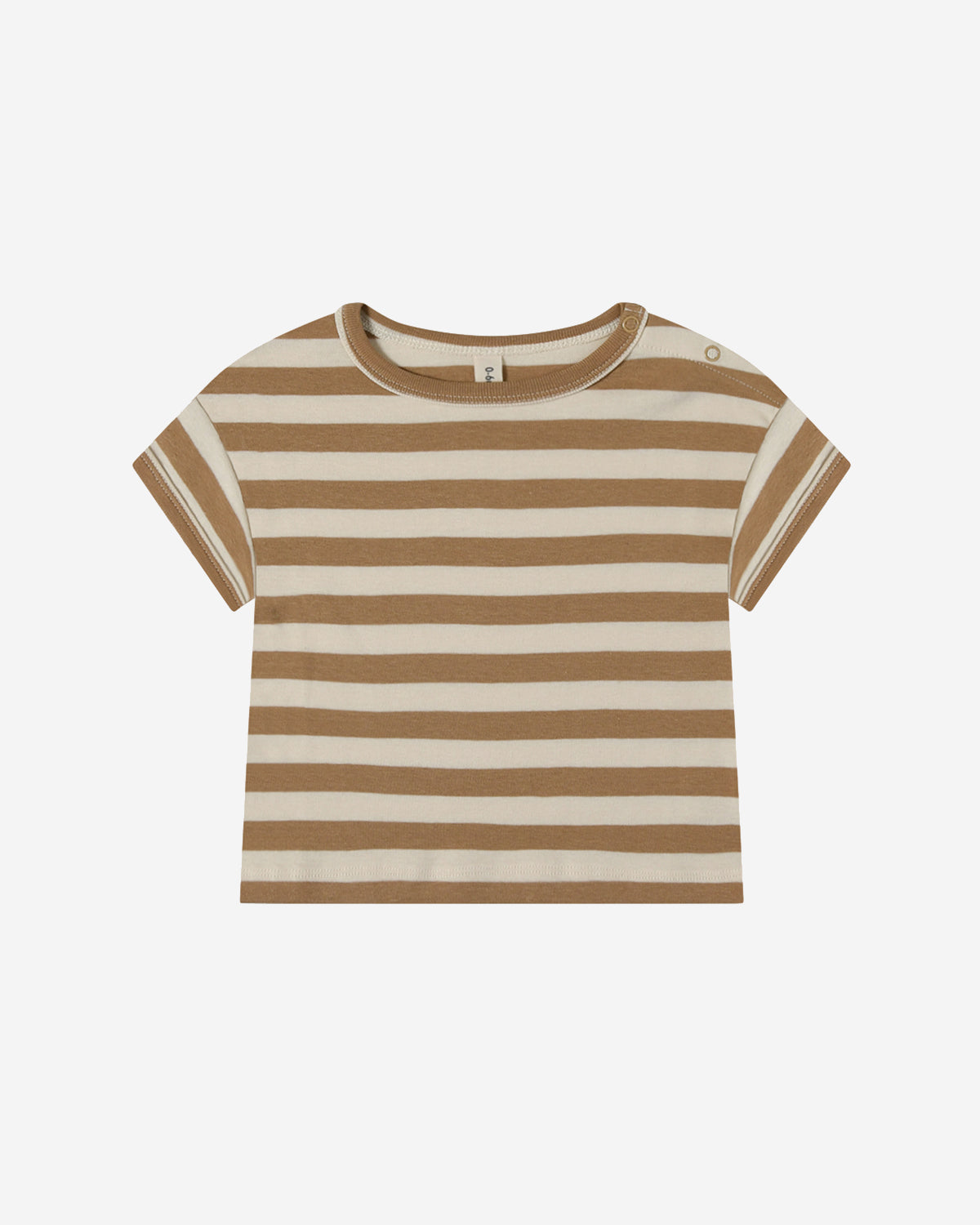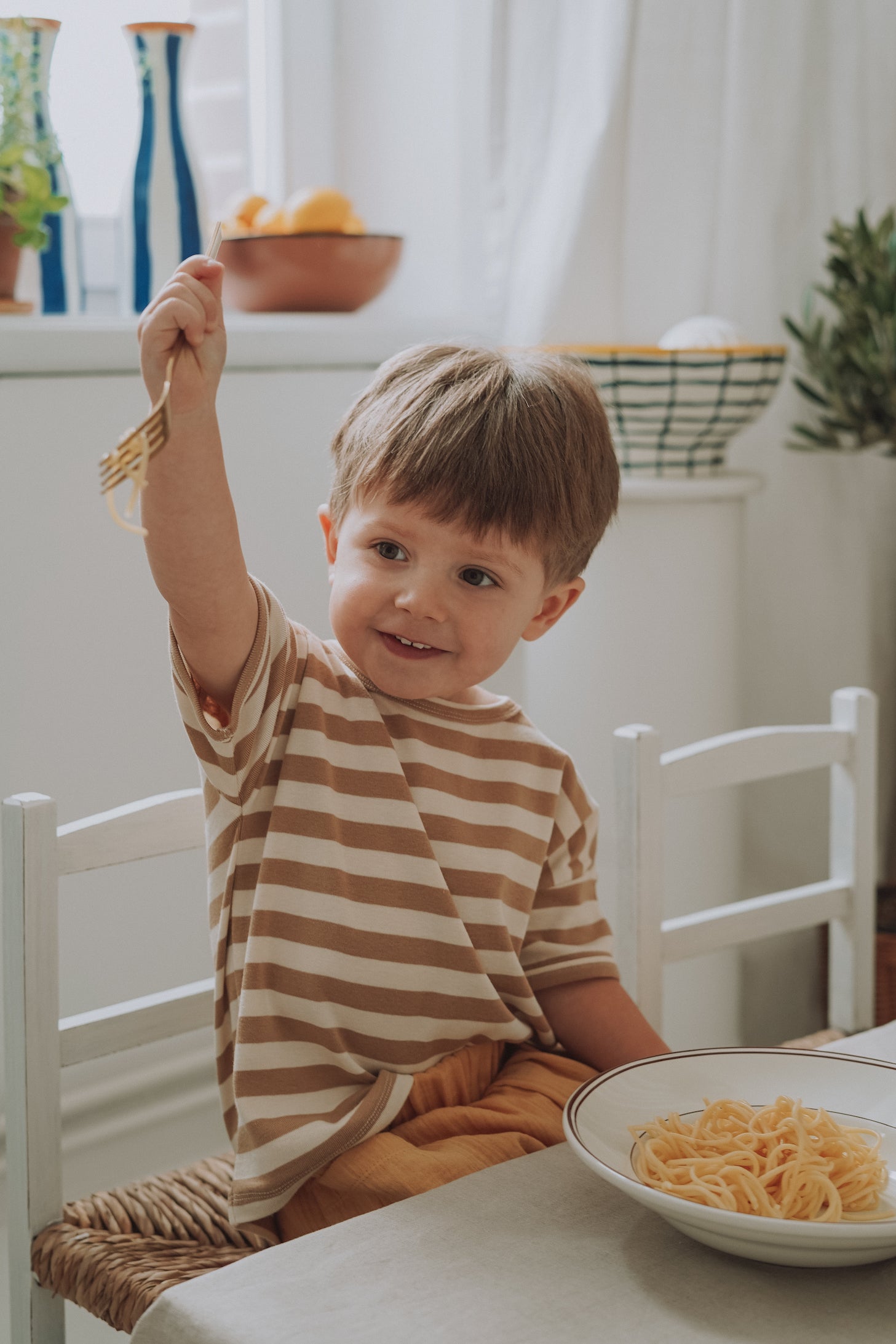 This lightweight organic cotton t-shirt is perfect for wearing from beach to lunch. It has all over golden-beige stripes and slightly oversized cut. An ideal choice for warmer days. Match it with any bottoms from our Fun, Food, Friends collection!