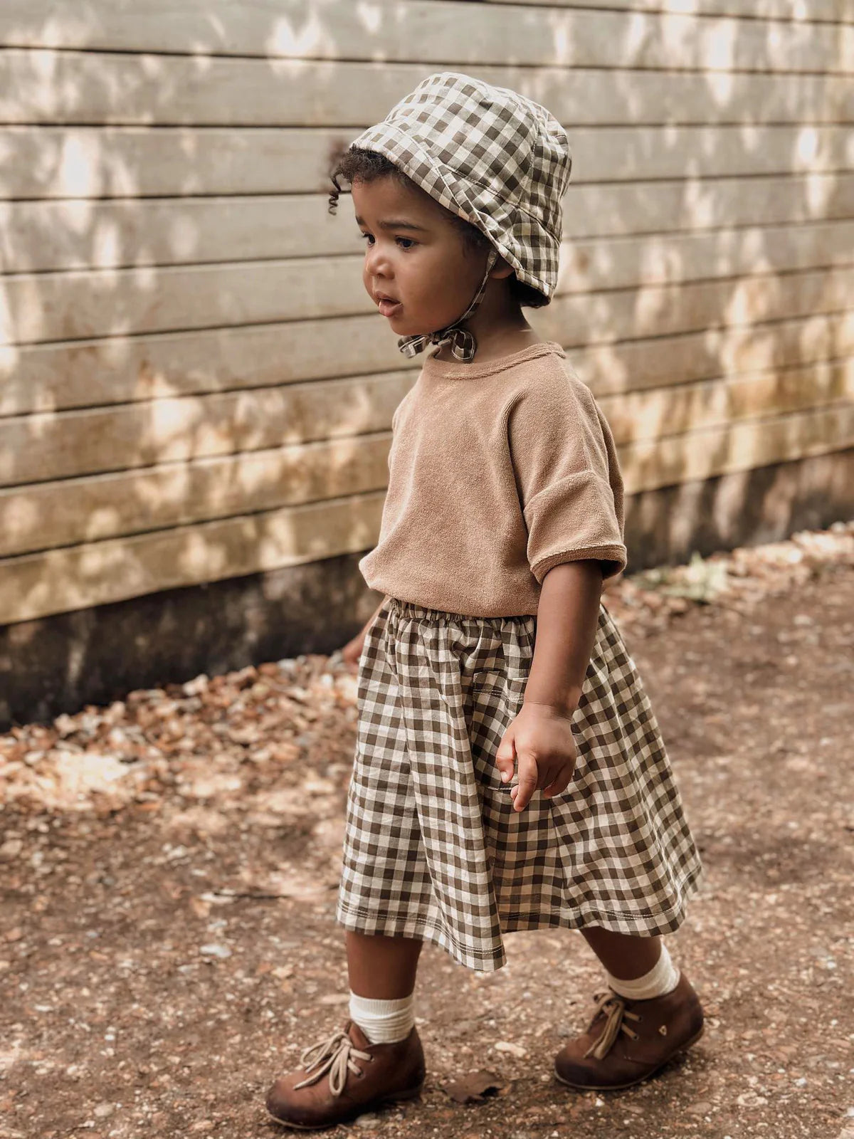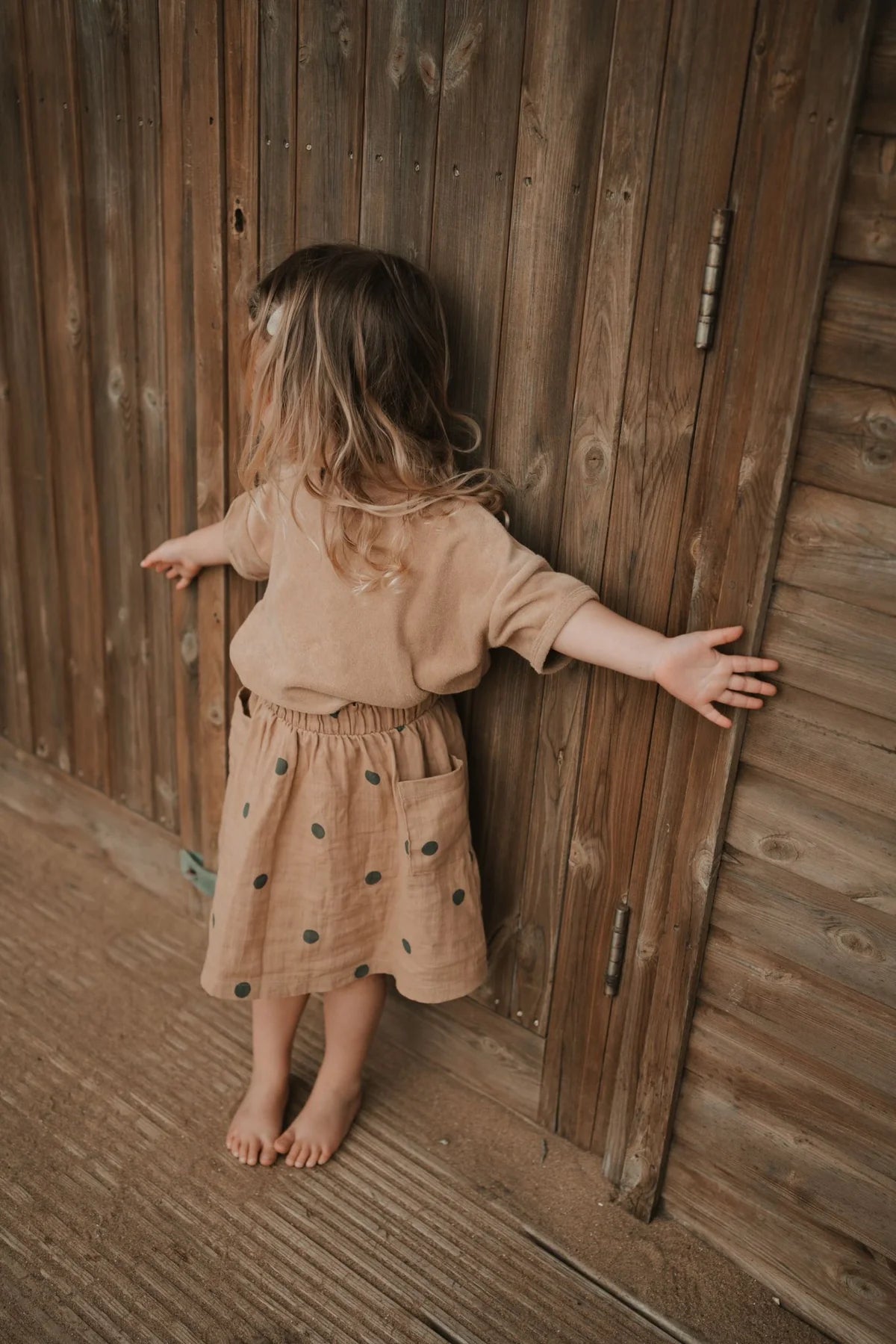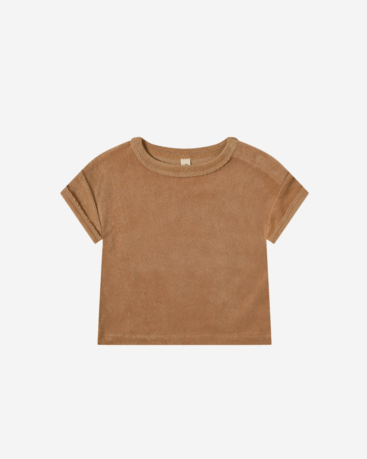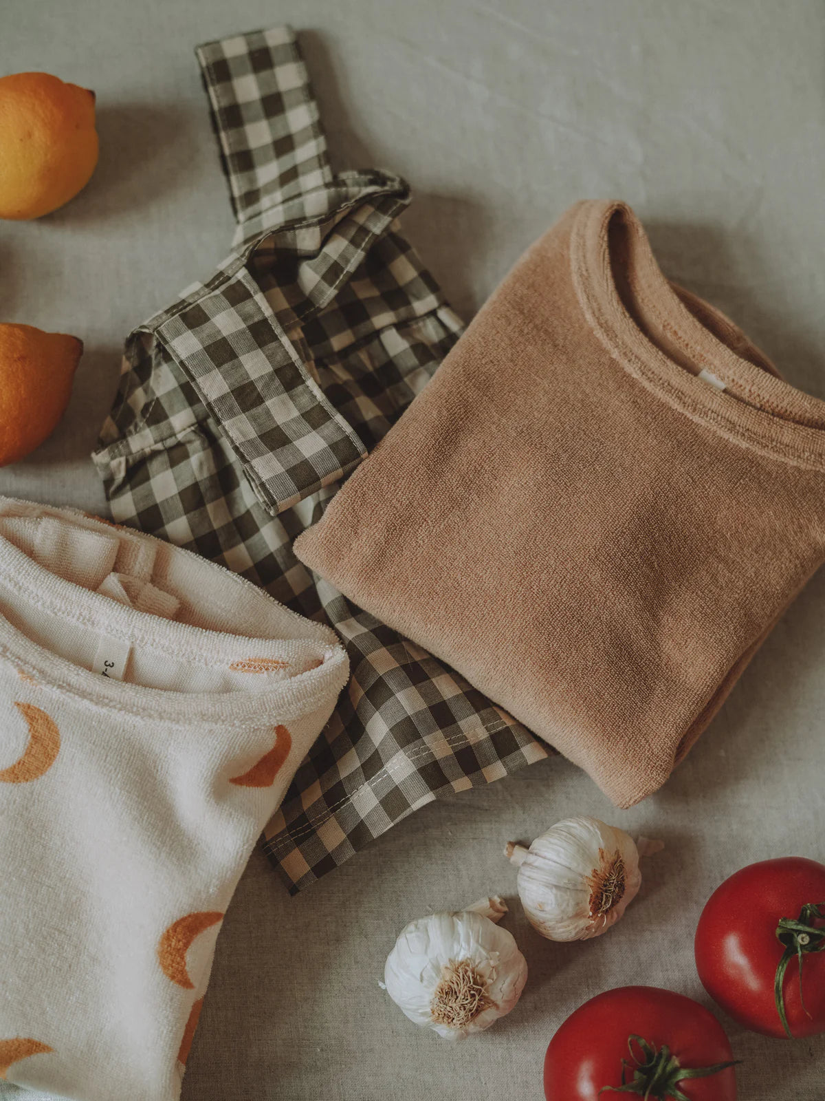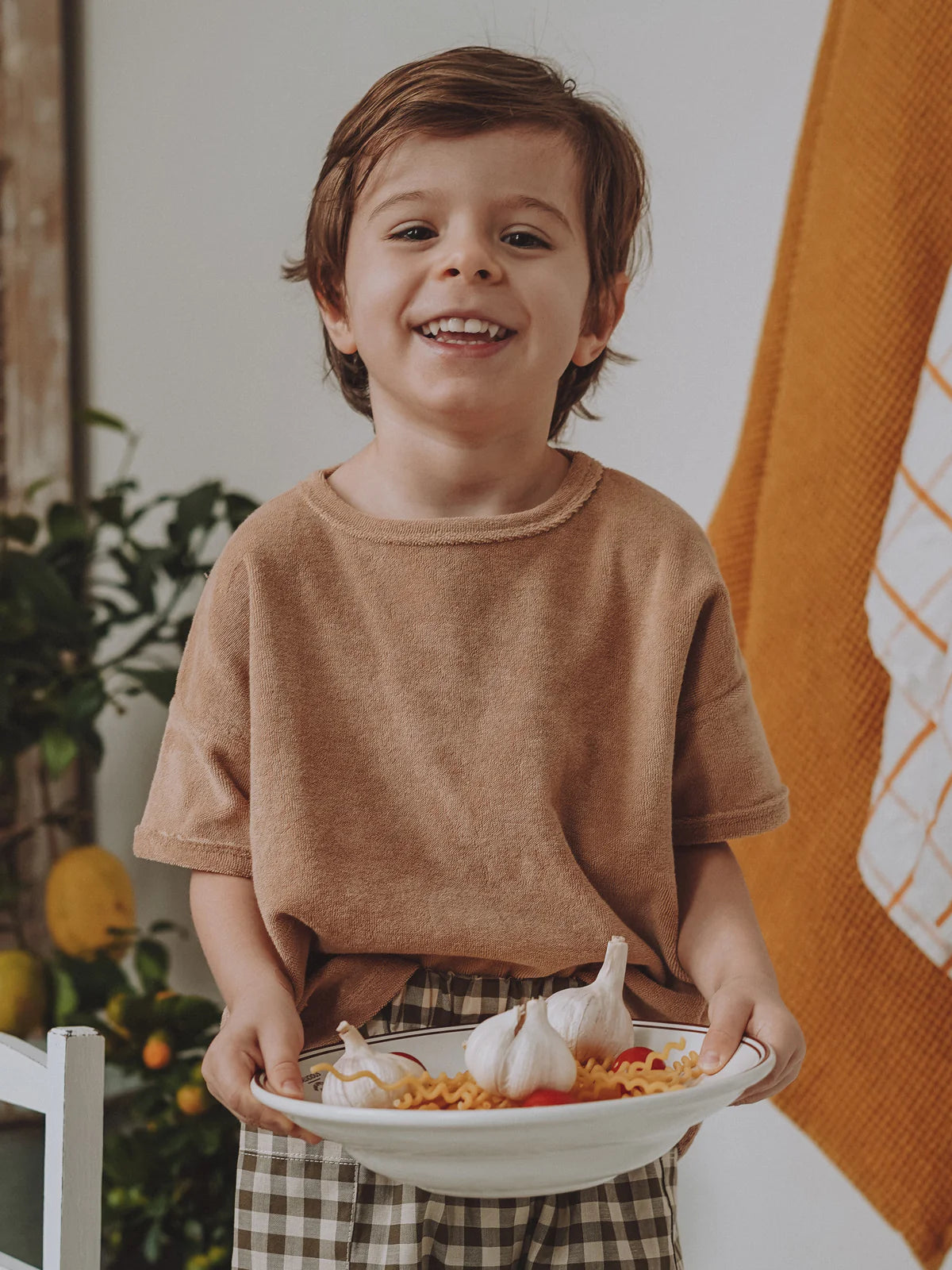 This butter-soft oversized t-shirt in a NEW golden hue is ideal for warmer days. Made from the softest terry cotton is the perfect every day tee for your little one. Mix and match with other pieces form our Fun, Food, Friends collection!