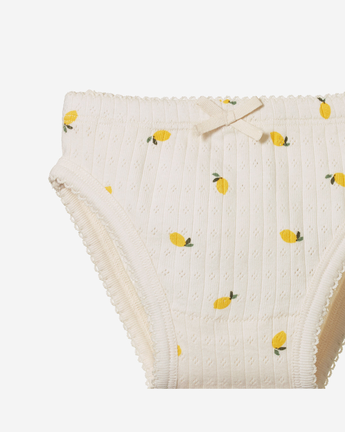 A classic style underpant in our beautiful organic cotton pointelle fabric. This knitted fabric has a nostalgic quality and is super soft and stretchy, making it the perfect fabric for comfort. Featuring a soft elastic waistband, picot stitching and a sweet bow at waist.