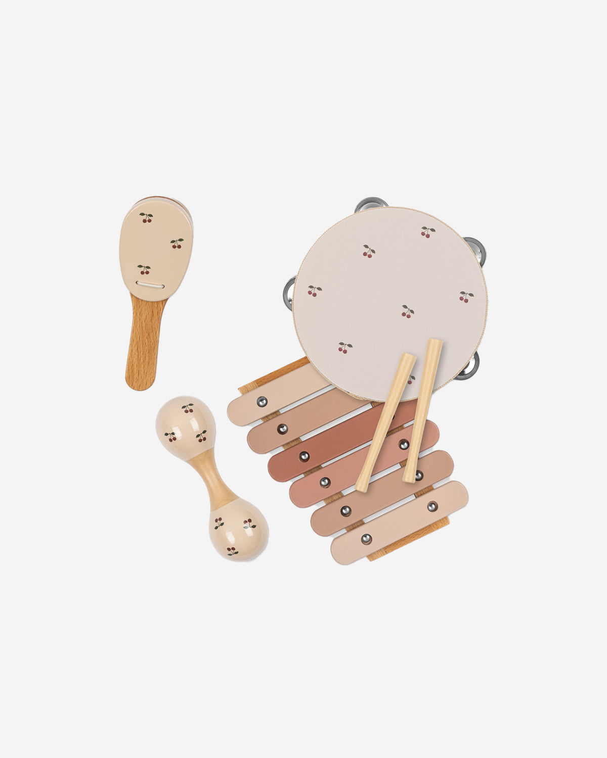Set of wooden music instruments, including tambourine, castanet, maracas, and a xylophone with drumsticks. The instruments live in a cute little suitcase that is ideal for storage.