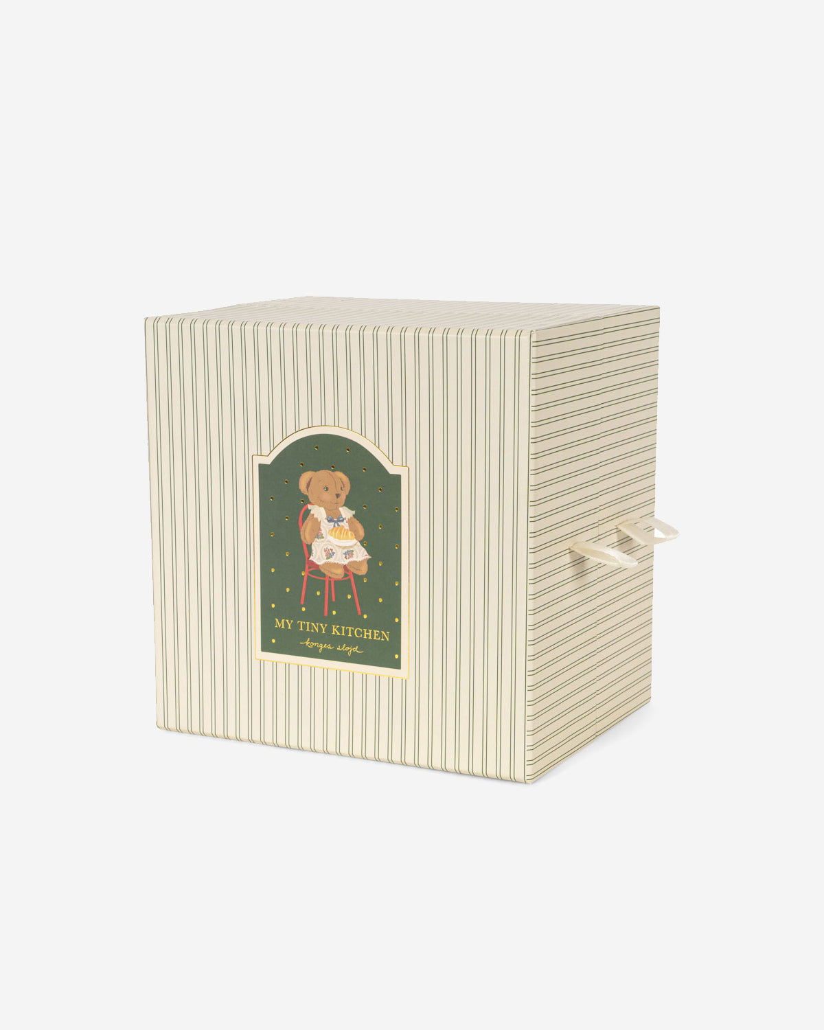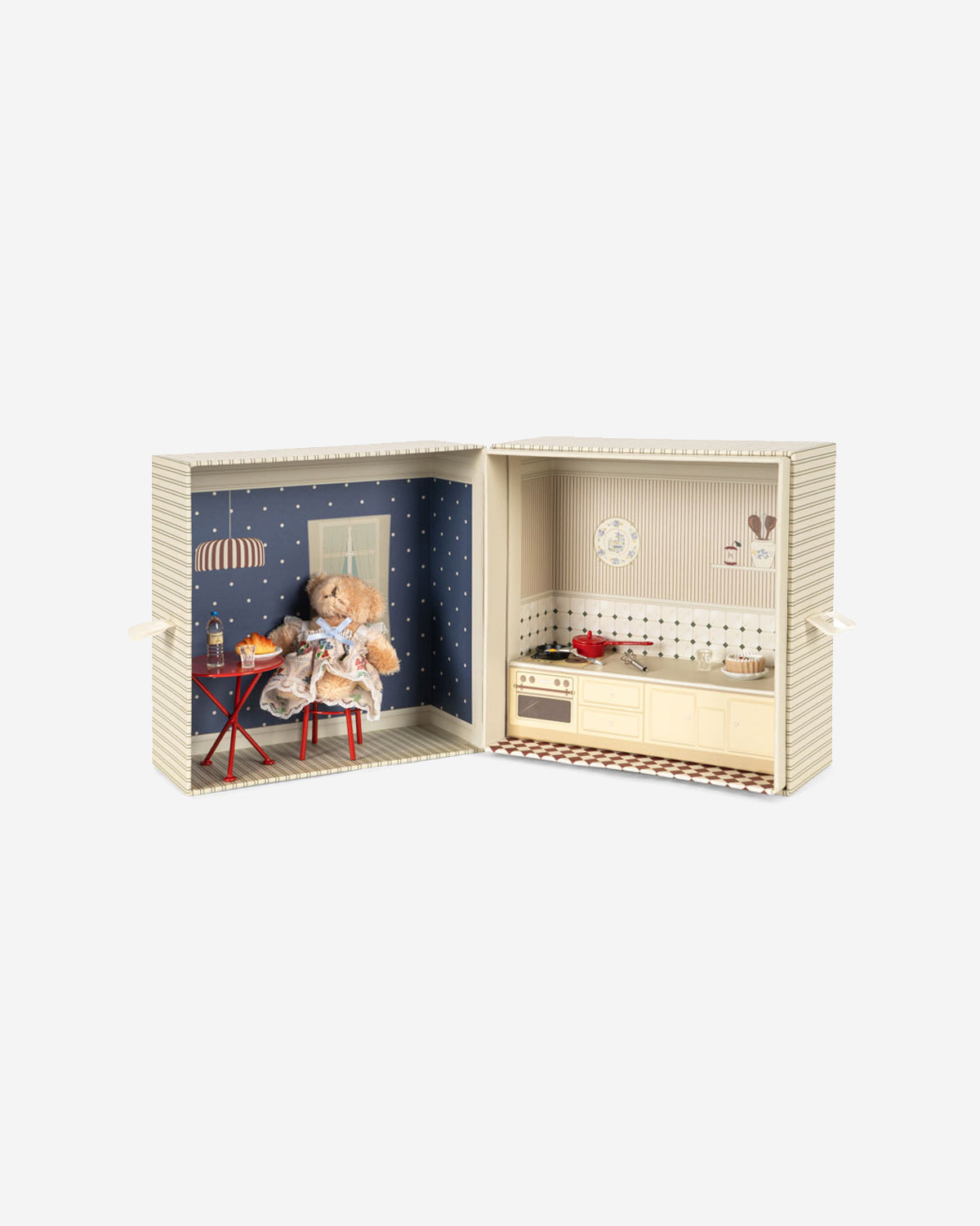 So tiny and so cute. This little tiny house is made for your favorite new tiny teddies. Complete with a kitchen and dining room, the tiny house comes with a little chair and table, and a little pastries and beverages that are prepared in the kitchen. Includes a tiny teddy to play with.